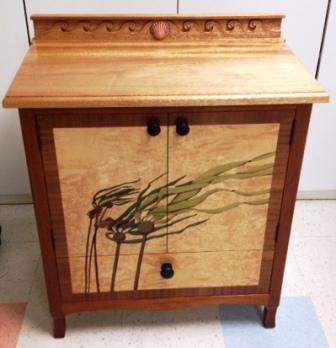 Tom Gaston showed a cabinet he made in a Paul Schurch class using packet style marquetry. He used commercial veneers on Baltic birch plywood. The piece has a carved top rail and uses mahogany, maple, poplar, and lacewood in its construction.