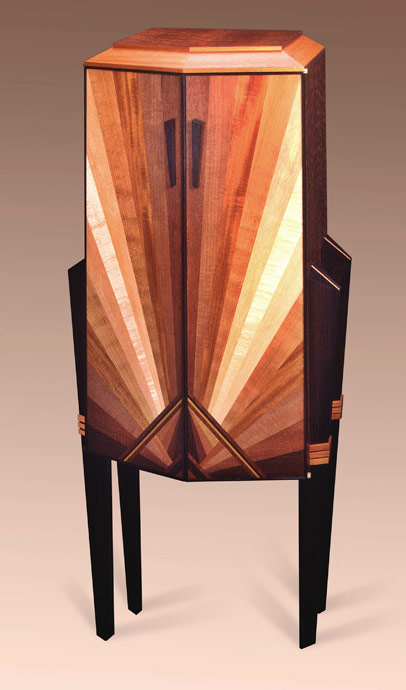 He designed and made an elaborate bar cabinet and integrated hardware, featuring bottle and glass racks that open automatically when the lid is raised. And this beautiful piece was made for a couple that does not drink.
