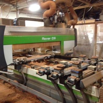 The two CNC routers are a Biesse C6.50, a 4-axis machine and a Biesse C9.50, a 5-axis machine, the difference being that the 5-axis machine has one more rotational motion. Both machines have tool carousels with 33 tools and 32 drills, which are exchanged under program control. We were able to watch as these machines performed the milling of a door lock mortise on full size door clamped horizontally on the bed.