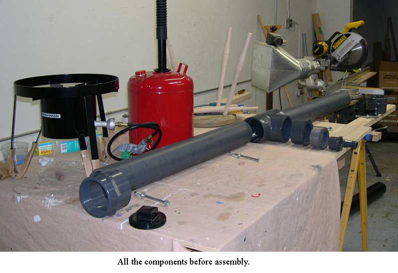 The Ultimate Steam Box by Mike Dunbar meets all these requirements. Using Schedule 80 PVC pipe and fittings, the pipe is impervious to steam heat, will not absorb water and will dry quickly, ready for storage in a few minutes. I made mine from 4 inch inside diameter schedule 80 PVC approximately 6 six feet long. Using a schedule 80 tee connection, I cut the pipe into two equal lengths and glued it to the tee. Using a series of reducers, I fitted a connection using 1.5 inch schedule 80 PVC into a standard radiator hose. I chose radiator house as a safety and efficiency issue. With radiator hose, the stiffness of the hose and its wide diameter keeps the path for the steam open under any conditions. The hose leads to a boiler, simply a steel can of 5 gallon water capacity. As a safety feature, the steel can may not ever have been used to store any oil, gasoline or other hazardous material. I use an oil collection can that is generally sold in auto supply stores with the can, a pipe and a large funnel device to position under an engine. I cut the funnel off the pipe and use the threaded end of the pipe as the connection to the boiler. Any screen in the pipe has to be removed, as the hot steam will cause any screen to rust and eventually, create a blockage problem. The boiler has to have two unrestricted openings. The supply hose from the boiler to the steam box supplies the steam. The second opening holds a funnel and a cork. The funnel is used to refill the boiler without shutting off the steaming process. It also acts as a safety relief, should something cause the supply line to become blocked. Each end of the steam box tube has threaded end caps attached. These are the ports in which wood is placed and removed from the tubes. Spaced just below the halfway point on the midsection of each tube is a series of stainless steel or chromed bolts. These bolts suspend the wood, so the wood can be completely bathed in steam. Allowing the wood to touch water will lower the temperature of the wood and instead of steaming, you end up soaking the wood. Two 1 inch diameter holes, one at each end of the pipe, just before the end cap female fittings, are drilled to act as relief holes. They also provide a visual clue as to the readiness of the steam box to accept wood. The relief holes allow water (old steam) to drain without lowering the tempurature of the box. But it also allows a full bathing of the wood in steam. Wood in this type of box has to be added and removed using tongs or steam proof gloves. No one is fast enough to snatch the wood out of the box before they are burned by the steam. The steam box has to be level to be used correctly. I built a cradle for mine, so once the cradle is set up, I place the tube in the cradle and we are ready to hook up the boiler. The boiler sits on a propane burner, similar to that used for Cajun Fish Frys or Turkey Fryers. This boiler/steam box has to be used outside, best on a gravel or concrete suface, so as not to ignite any yard materials. I use my box to steam red oak for Windsor chair parts. This is green wood and has to be shaped, steamed and bent quickly. My shaped parts have to be steamed the day they are formed. Steamed red oak has to be removed from the box and placed in its form in less than 30 seconds. So organization and a clean work area is a must. Parts to build your own Ultimate Steam Box can be found at electrical/plumbing supply wholesalers and auto supply stores. (Or you can order a kit from the Windsor Institute: www.thewindsorinstitute.com/tools.html. ) I purchased my schedule 80 pipe at State Plumbing Supply, which in located in the industrial area in San Carlos, at 1000 American (at the corner of Bayport Way). State Plumbing was the only supply store that I could find that had schedule 80 fittings in stock. As I recall, 6 feet of pipe and all the fittings came to a little under $80. For the boiler, I purchased an oil recovery can, with telescoping drip/catch pan from PEP Boys Auto Supply. Before I left the store, I went to the parts counter and asked them to sell me a radiator hose that could slip over the telescoping pipe between the catch pan the the threaded insert. I cut the telescoping pipe to fit my particular set up and fastened the hose at both ends with one band clamp at each end. The 1.5 inch plastic pipe is only a friction fit between the reducer rings in the tee assembly. Pictures of my construction and set up follow.